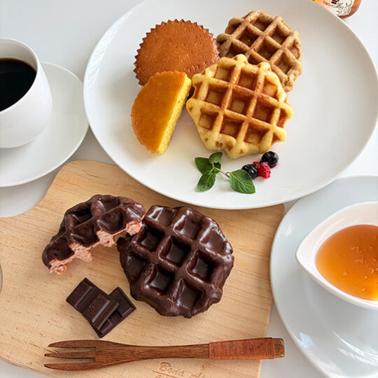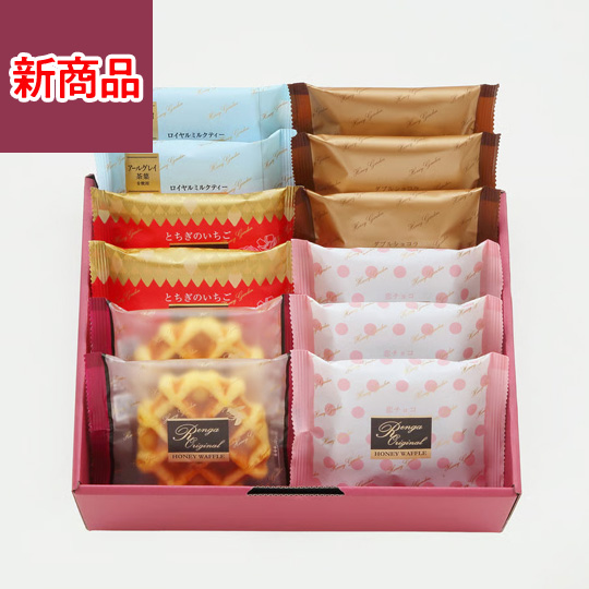 <ハニーワッフルセレクトショコラ12個> プレーン・とちぎのいちご・ロイヤルミルクティー各2個、恋チョコ・ダブルショコラ各3個 れんがHoney Gardenの焼き菓子には全て国産純粋はちみつ「純みつ」を使用しております。 冬季限定のショコラワッフルが入ったセットです。 【ハニーワッフル】 やさしいはちみつの香りとふっくらしっとりとした食感が特徴です。 【とちぎのいちごハニーワッフル】 いちごの甘さだけではなく、いちご本来の酸味を出した商品となっております。   【ロイヤルミルクティーハニーワッフル】 ティーアドバイザー監修。華やかな香りのアールグレイ茶葉を国産乳製品でじっくり抽出。はちみつと相まって奥深い味わいの「ロイヤルミルクティー」。 【恋チョコハニーワッフル】 ※冬季限商品 とちおとめのピューレを練りこんだ「とちおとめハニーワッフル」の上にビターチョコレートをかけました。 甘酸っぱい恋のような味の「恋チョコ」。 いちごとビターチョコレートの相性は抜群です。 【ダブルショコラハニーワッフル】 ※冬季限定商品 ショコラ生地ワッフルの上に、チョコレートを贅沢にかけたハニーワッフルです。 甘すぎず、ビターな味わいです。